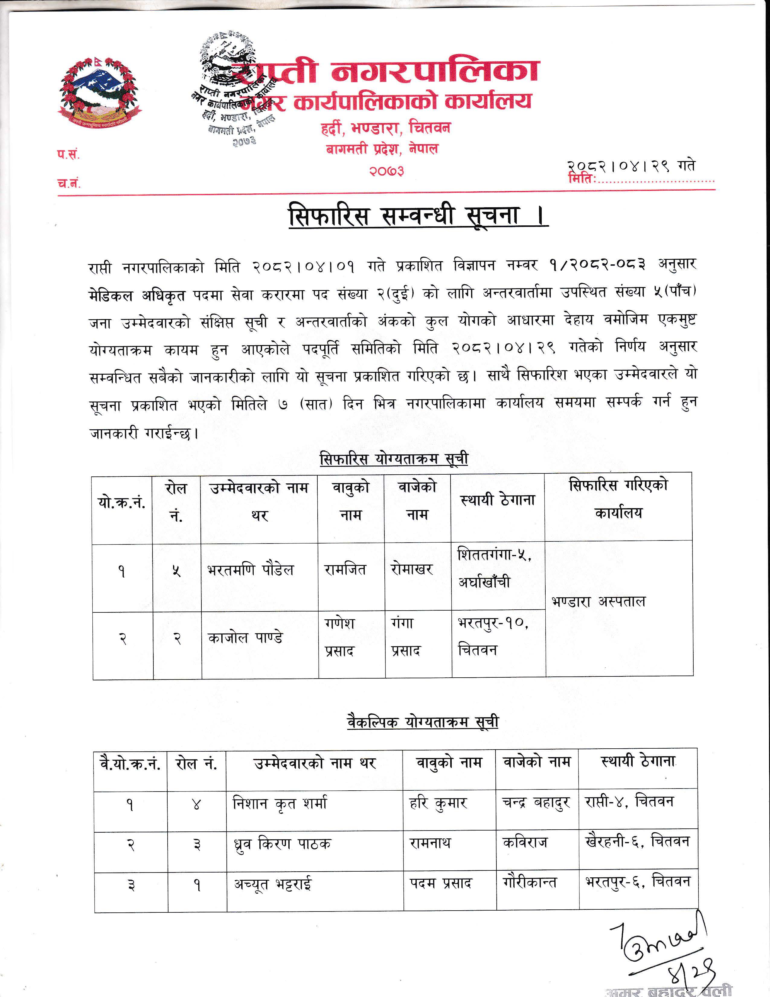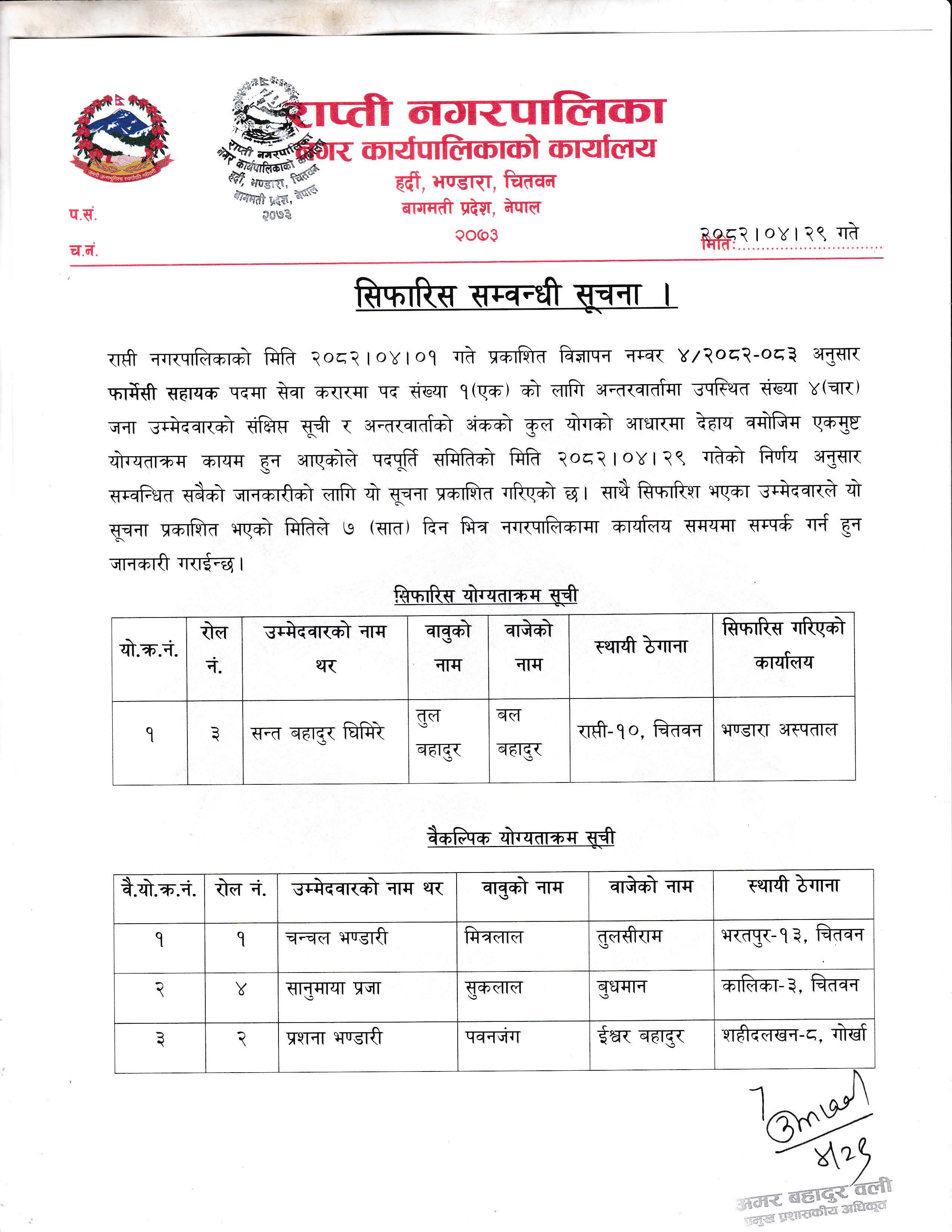 सिफारिस सम्बन्धि सूचना ।